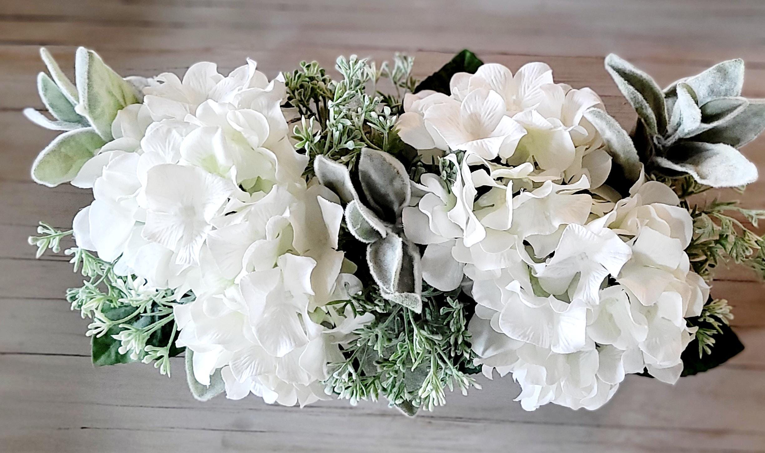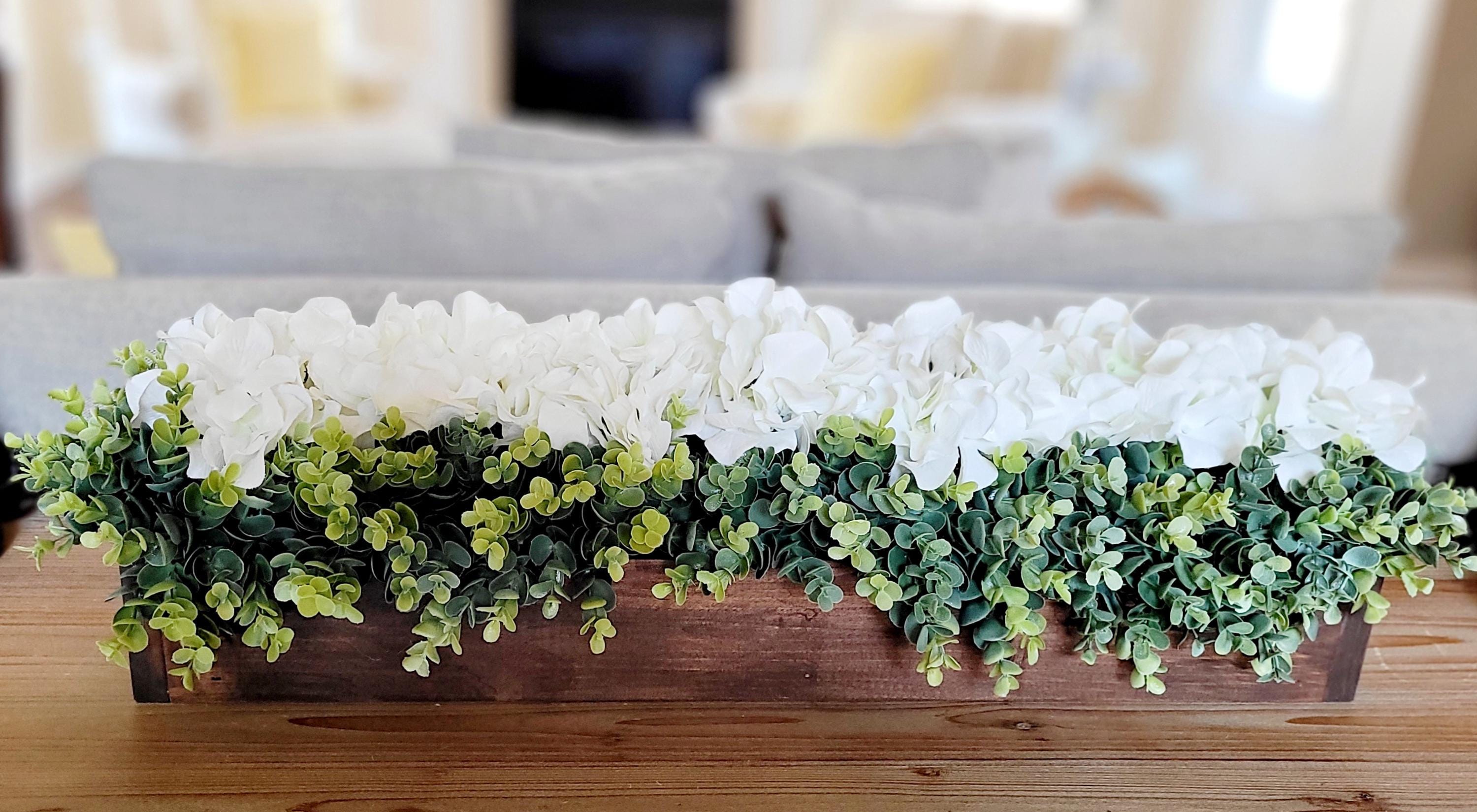 Hydrangea Centerpiece – 255 Inch Long Whitewash Wooden Box Farmhouse Table Decor