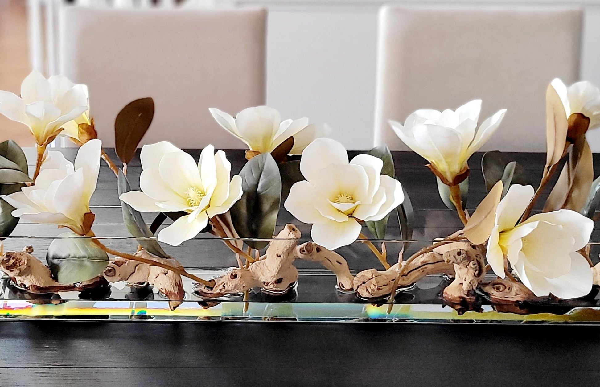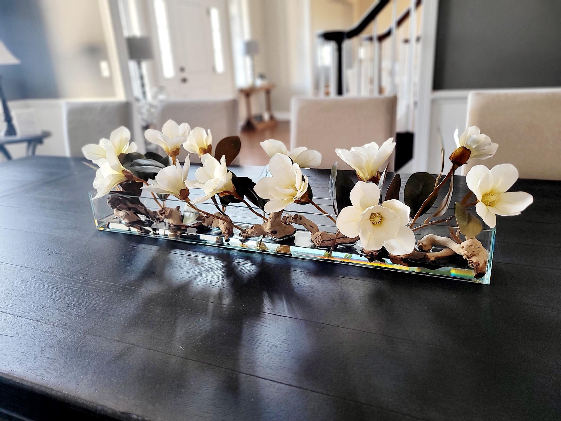 Decorate your home with "Luxury Dining Table Flower Arrangement for Home Decor featuring Realistic Magnolia Flowers in a Long Glass Container in faux water. Elegant Floral Centerpiece for Dining with Stunning, Lifelike Flowers."