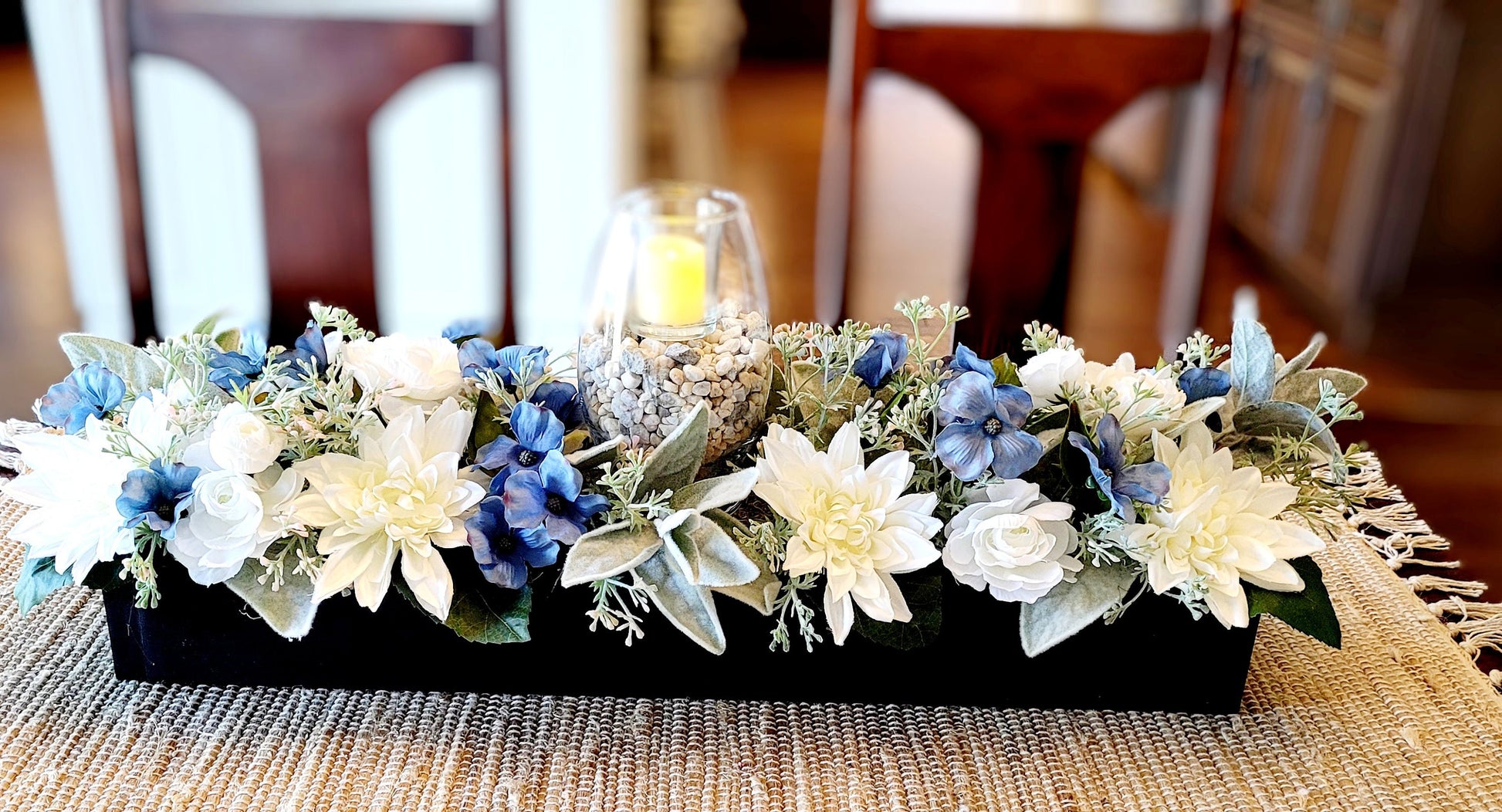 Handmade with love ❤️, this candleholder centerpiece arrangement in a black wooden planter box measures an impressive 25.5” long and is adorned with neutral spring flowers, greenery, and lamb’s ear. Finished off with a large glass hurricane and inner candleholder in the center with decorative river rock. Perfect to add warm and cozy farmhouse style to any home decor or as a wedding centerpiece. Use as a centerpiece, place it over your mantle or on a kitchen island, this arrangement will be sure to complete your Spring decor. Wood planter box measures 25.5” (L) x 5” (W) x 4” (H) in a black finish. Made with quality material. Custom orders available! Contact our shop with your request!