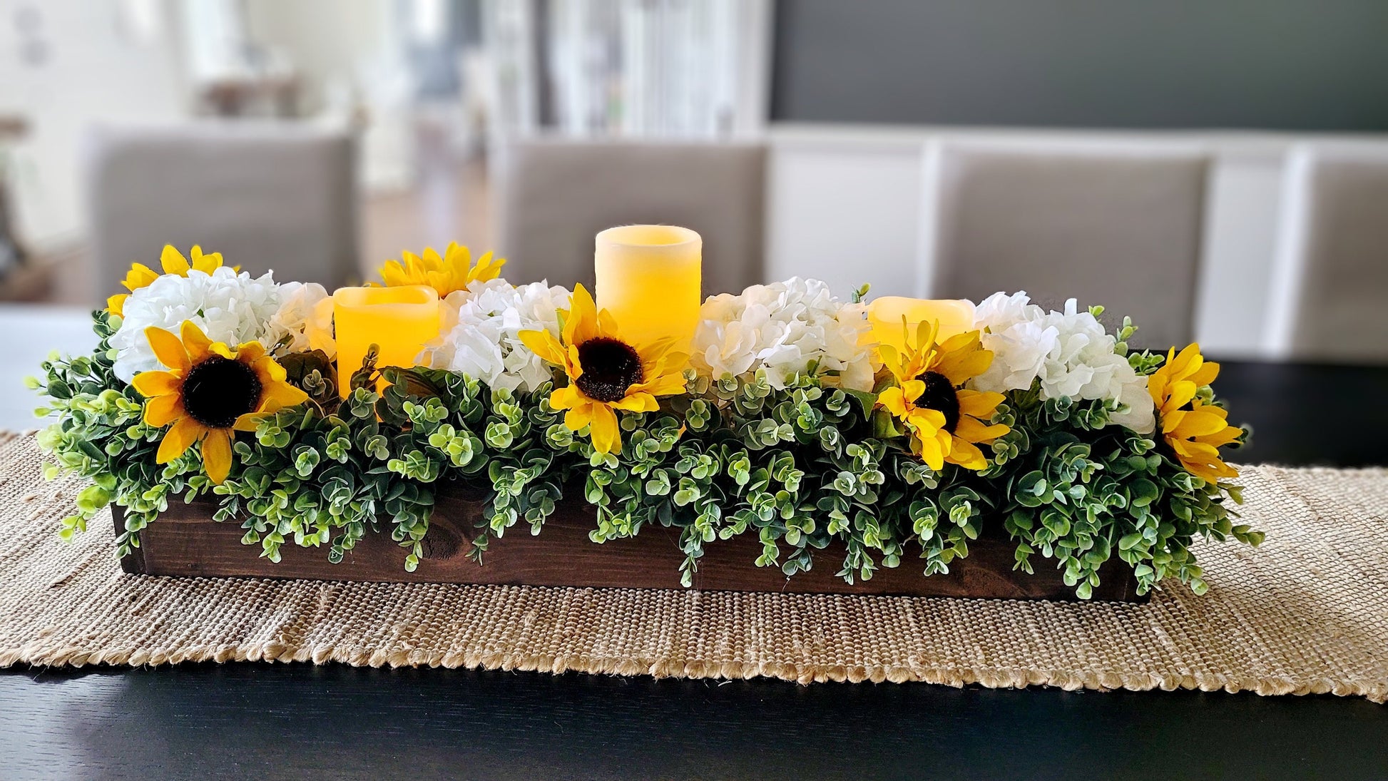 Sunflower Fall Table Arrangement Fall Sunflower Faux White Hydrangea Arrangement Dining Fall Decor Flame-less Candle Fall Table Decor Fall